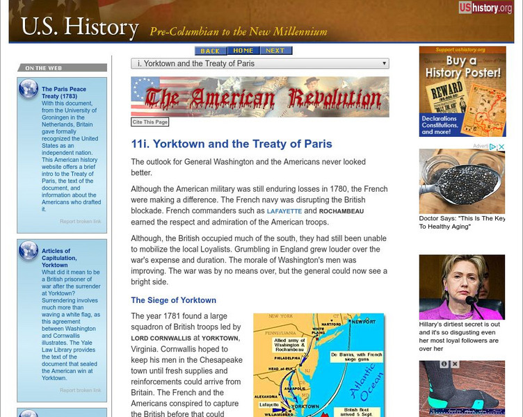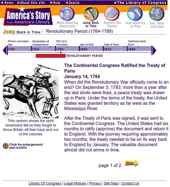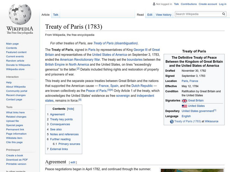 From the Library of Congress, this article presents detailed information about the 1783 Treaty of Paris and the end of the Revolutionary War. Contains many links to many different primary resources as well as details of the Treaty...