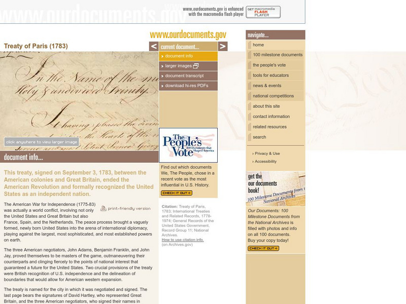 Interactive image of the Treaty of Paris of 1783. Allows for downloads of the document as well as seeing large, clear scanned in images of the documents. Click on the Tools for Educators to find a wealth of teaching resources.
