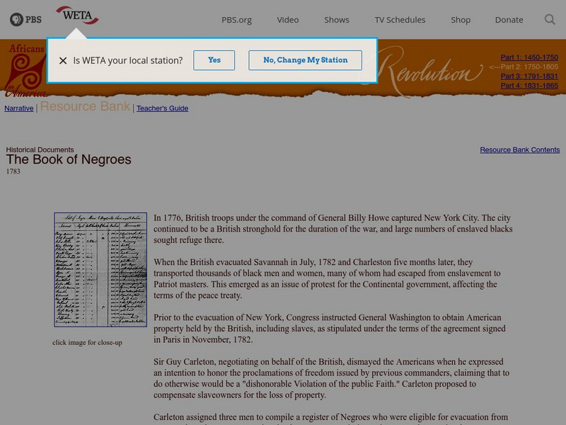 An interesting look at the compiling of the Book of Negroes, a register of those whom the British promised freedom during the course of the Revolutionary War. Find out why this was a component of the Treaty of Paris of 1783. From PBS.
