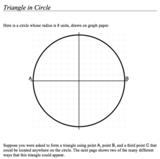 Even kindergartners can draw triangles in circles, but the assessment task requires a bit more geometric knowledge. Scholars investigate triangles that have a diameter of a circle as one of its sides. They must consider triangles that...