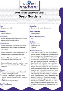Marine biology beginners read about the 2005 Florida Coast Deep Corals expedition, research phylum Cnidaria, and then report on a specific coral deep-sea coral group. There is an abundance of background information and internet resources...