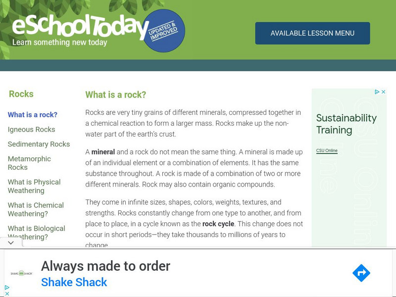 [Free Registration/Login may be required to access all resource tools.] Presents the three major rock types and the rock cycle.