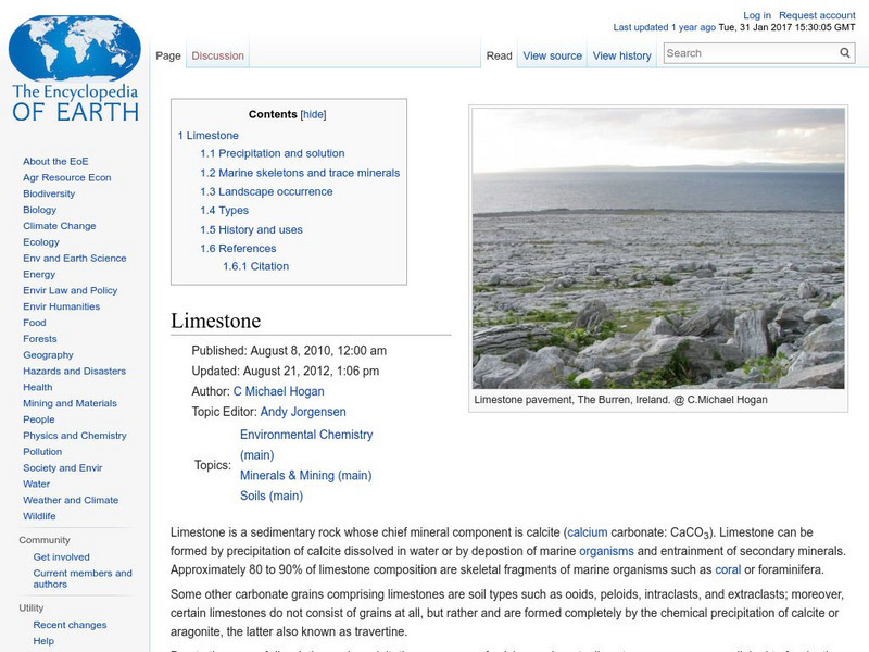 Article explaining what limestone is, how it is formed, where it occurs, the different types, and how it has been used throughout history. (Published: August 8, 2010)
