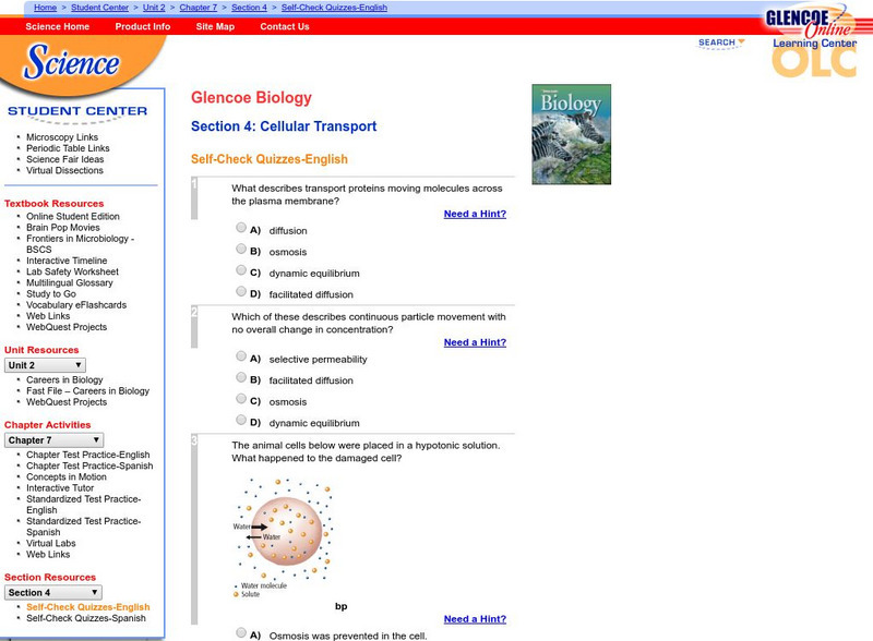 Glencoe Biology: Cellular Transport: Self Check Quiz