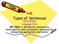 This grammar PowerPoint reinforces the three types of sentences and how to identify them correctly. Each slide of this PowerPoint gives examples and definitions of declarative, interrogative and exclamatory sentences. The final few...