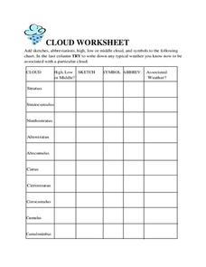 In this cloud activity, students fill in a table for the ten types of clouds with their location in the sky, a sketch of each type of cloud, its symbol, the abbreviation for the cloud type and the weather each is associated with.