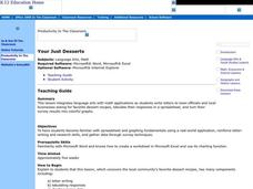 Students write letters to town officials and local businesses asking for favorite dessert recipes. They tabulate their responses in a spreadsheet. Students turn their survey results into colorful graphs.