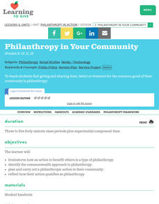 Students develop an understanding of philanthropy through definition and actions. Students to get to know themselves and their classmates by engaging in activities imbedded in this lesson. They investigate the types of philanthropic...