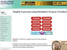In this online math worksheet, students simplify expressions by using the Distributive Property. This excellent resource allows the students to check their answers, and to get "hints" should they run into difficulties. A terrific...
