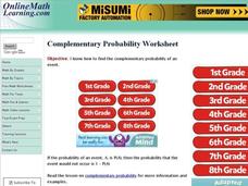 In this probability learning exercise, students solve complementary probability word problems with 4 problems in them. Students complete 2 problems.