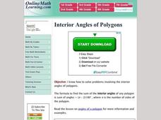 In this online math learning exercise, students determine the interior angles of polygons given their exterior measurements. This excellent resource allows the students to check their answers, and to get "hints" should they run into...