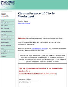 In this online math worksheet, students determine the circumference of a variety of circles given their diameter. This excellent resource allows the students to check their answers, and to get "hints" should they run into difficulties. A...