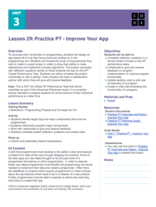 The last installment of a 21-part unit is a practice performance task that asks class members to design an app using skills from the unit. Scholars take one of the previous apps from the unit and modify it by adding elements and making...