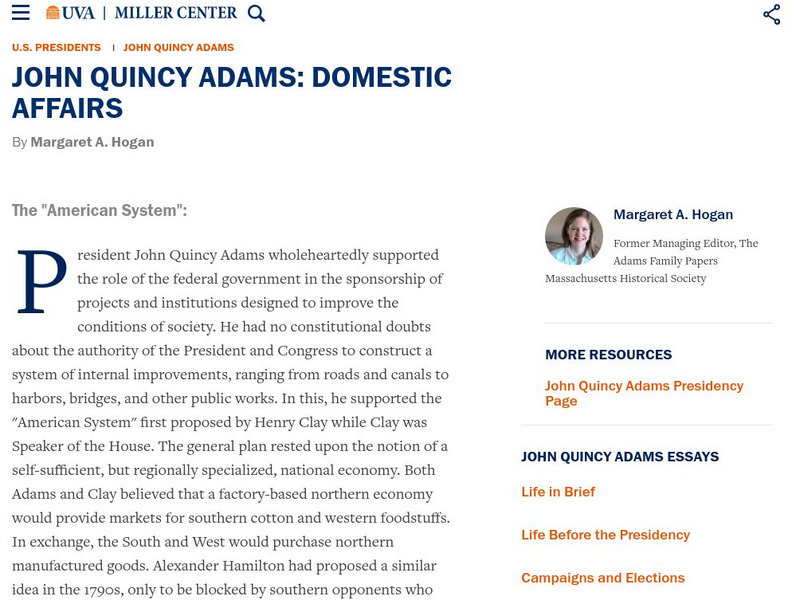 Miller Center at Uva: u.s. Presidents: John Quincy Adams: Domestic Affairs