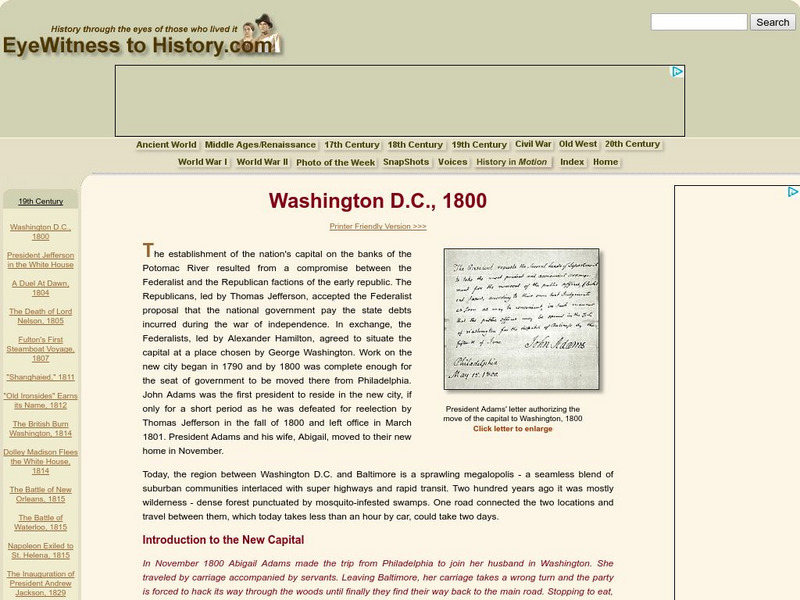This article offers personal accounts from Abigail Adams regarding her journey and arrival in the new national capital.
