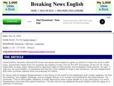 In this United Nations worksheet, students read the article, answer true and false questions, complete synonym matching, complete phrase matching, complete a gap fill, answer short answer questions, answer discussion questions, write,...