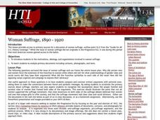 Tenth graders examine the role of women in the early 1900s. In groups, they use the internet to research groups who favored or opposed giving women the right to vote. To end the lesson, they note the methods used by women to finally gain...