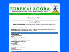 Learners explore poetry. They investigate the poetry al around them. Students examine poetry in order to create a deeper understanding of poetry. They read and write a variety of poetry.