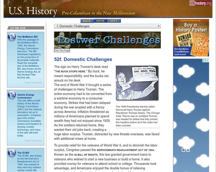The American soldiers returning from World War I had a huge impact on the economy. Read about President Truman's domestic policies and find out about the surprise of the election of 1948.