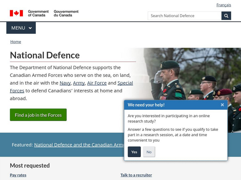 This resource provides information about the activities of the department and the Canadian armed services. Use the site map, navigation tools, or search to get to your particular topic of interest, whether it be defense policy, resources...