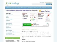 Students create friendship hearts for Valentine's Day. In this holiday lesson, students make paper hearts out of construction paper. They write compliments for other students and hang it on crepe paper above their desk.