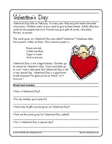 In this Valentine's Day reading worksheet, students read facts about Valentine's Day and an example poem. Students then answer 5 questions about the text.