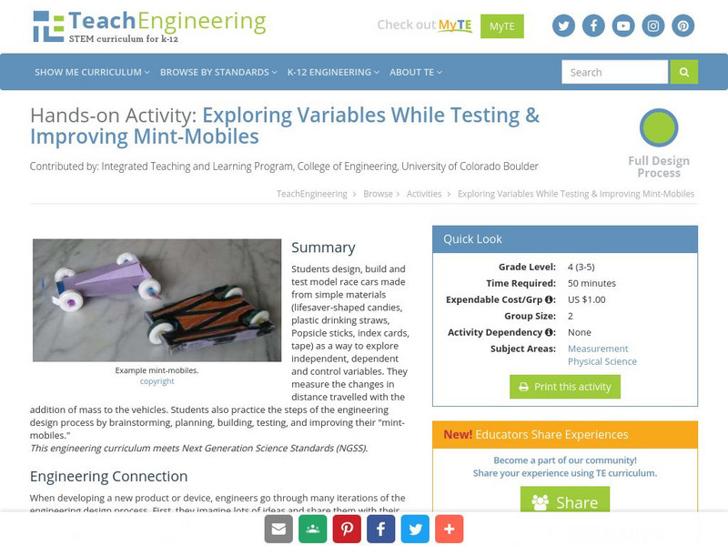 Students design, build and test model race cars made from simple materials (lifesaver-shaped candies, plastic drinking straws, Popsicle sticks, index cards, tape) as a way to explore independent, dependent and control variables. They...