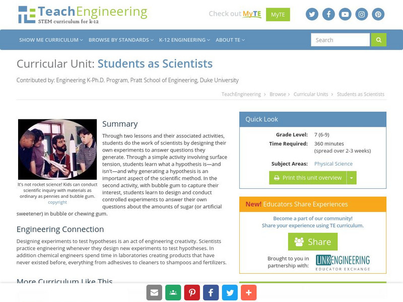 This curricular unit contains two lessons that let students actually do the work of scientists as they design their own experiments to answer questions they generate. In the first lesson and its associated activity, students conduct a...