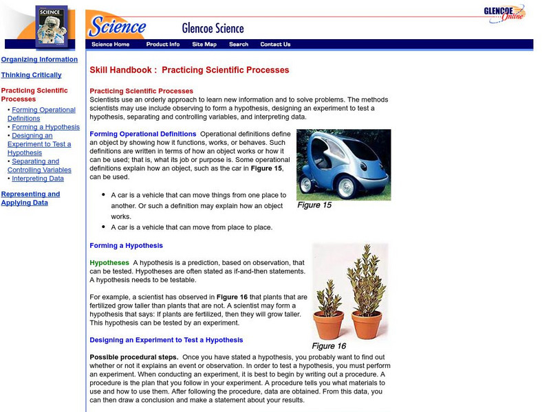 This site from Glencoe Publishing not only explains hypothesis but also tells how to design an experiment to test your hypothesis. Includes the difficult task of "Separating and controlling variables."