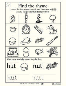 It's rhyme time! Little ones look at the image in each of four rows, they then circle an image that rhymes. They match four rhyming words and trace the words hen and ten.
