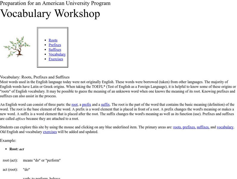 This vocabulary workshop will be helpful to anyone interested in brushing up on their skills. This site features a comprehensive look at root words, prefixes, suffixes and more.