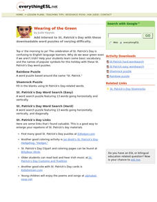 In this holiday worksheet, students solve the word search using the topic of Saint Patrick's Day and they develop new vocabulary skills.