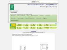 For this geometry worksheet, 6th graders study comprehensive facts pertaining to volume and measurement of geometric, three-dimensional figures. Students solve for 59 problems showing their work.