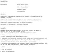 Eighth and ninth graders calculate the volume of a rectangular prism and a cylinder. For this liquid volume lesson plan, pupils use formulas to calculate the volumes of cylinders and prisms and then they use water to determine the...