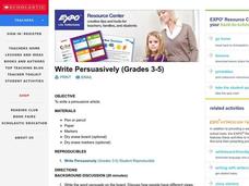 Students practice persuasive writing. In this writing lesson plan, students understand that there are different ways to write. Students build a list of words that can be used for persuasion. Students develop statements to use for...