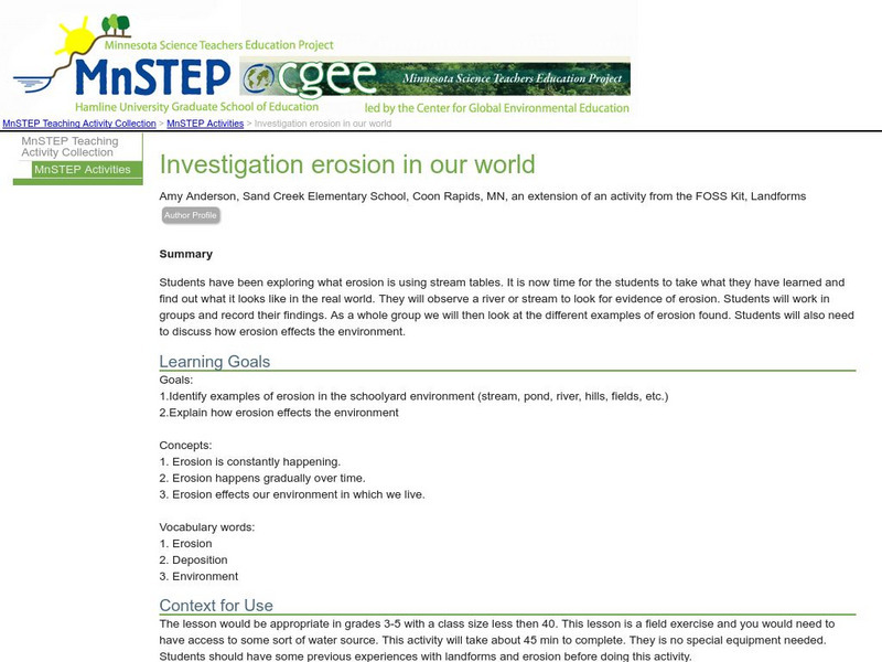 In this lab activity, students will look for evidence of erosion in river or streams. This activity should take place after students have observed erosion in a model.