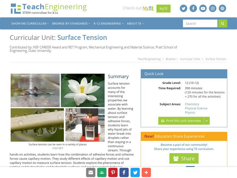 Surface tension accounts for many of the interesting properties we associate with water. By learning about surface tension and adhesive forces, students learn why liquid jets of water break into droplets rather than staying in a...