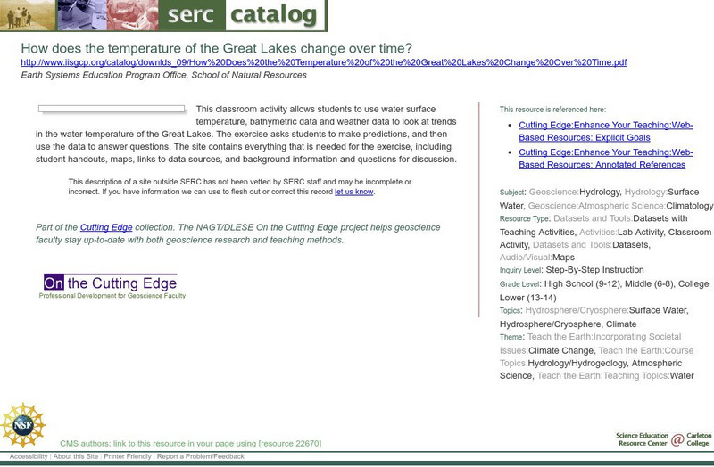 This activity allows students to use water surface temperature, bathymetric data, and weather data to look at trends in the water temperature of the Great Lakes.