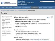 Students investigate water conservation. In this water conservation lesson, students list the uses for water and record their water usage for one day. Students graph the data and create a water conservation poster.