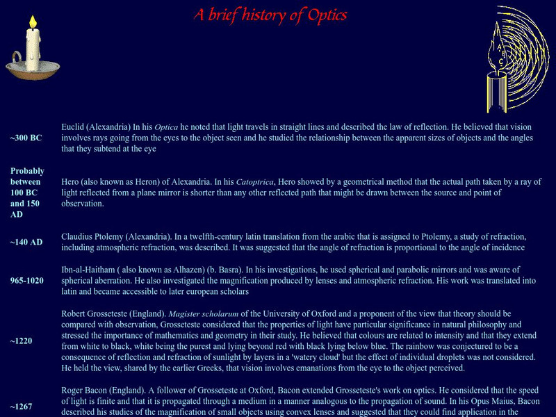 This timeline compiles an enormous amount of historical information from the field of optics. From 300 BCE to the present, strategic experiments, findings, and theories are described.