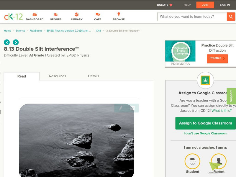 [Free Registration/Login Required] Learn about the interference and diffraction patterns that result when a wave passes through one or two thin openings using this interactive simulation. A PDF worksheet and a video tutorial are also...