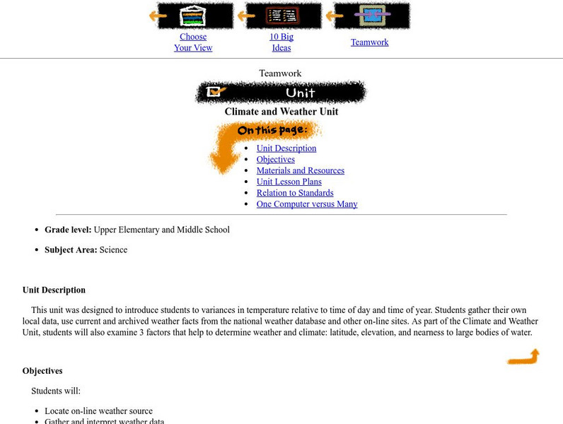 A weather unit designed to help the students examine 3 factors to determine weather and climate: latitude, elevation, and nearness to large bodies of water.