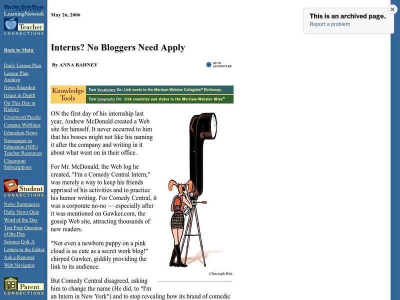 This article discusses the implications of employees including company information in personal blogs. Click on link to a lesson plan where students discuss the issues and create their own blogs.