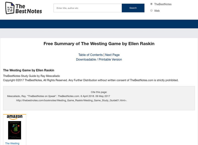 This is an online study guide for the mystery novel The Westing Game by Ellen Raskin including author information, literary elements, chapter-by-chapter summaries/notes, study questions, and analysis.