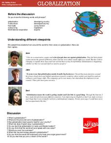 How familiar are your pupils with globalization? Hold a discussion on that topic using the questions and viewpoints provided here. Learners can study the vocabulary and read the points of view in order to prepare for the final talk.