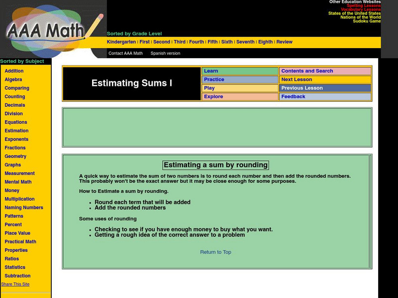 This site explains how to estimate sums of whole numbers. Gives practice and games to practice this skill.