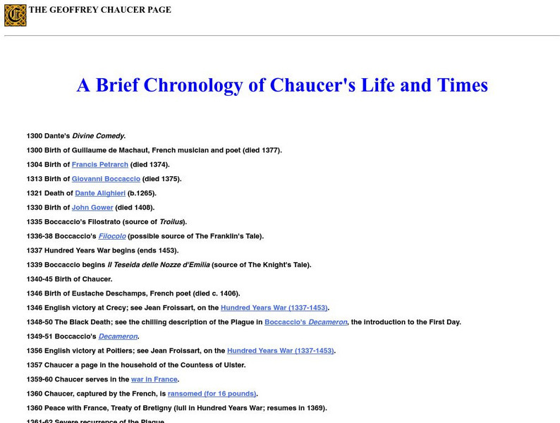 This timeline of Geoffrey Chaucer's life and times from 1300 to 1400 provides a historical and social context for The Canterbury Tales. Features links to related topics.