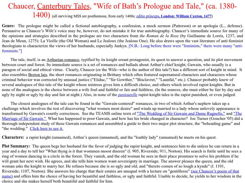 An excellent site from the UK. Includes biographical information on Chaucer, historical context, and in-depth information on the Wife of Bath, complete with the relationship between the prologue and tale, character analysis, and essay...