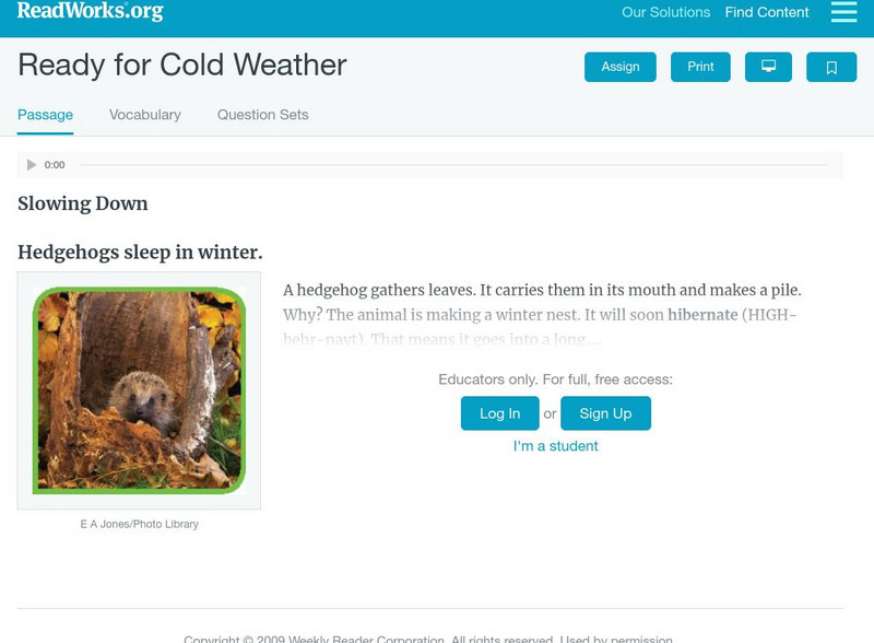 [Free Registration/Login Required] An information text about hedgehogs and how they hibernate in the winter. A question sheet is available to help students build skills in reading comprehension.