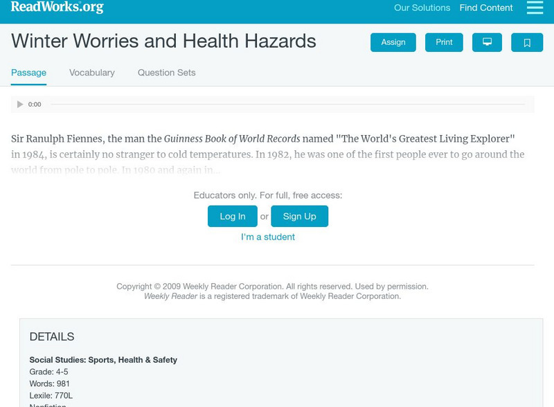 [Free Registration/Login Required] An informational text about the dangers of hypothermia and frostbite and how what precautions to take against them. A question sheet is available to help students build skills in reading comprehension.